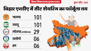 नई दिल्ली/पटना, 13 अक्टूबर। बिहार विधानसभा चुनाव में सीटों के बंटवारे को लेकर सत्तारूढ राष्ट्रीय जनतांत्रिक गठबंधन (राजग) के घटक दलों के बीच रविवार शाम को सहमति बन गयी जिसमें भारतीय जनता पार्टी (भाजपा) और जनता दल यूनाइटेड (जद यू) को एक बराबर 101-101 सीटें आवंटित की गयी हैं।