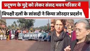 नई दिल्ली, 04 दिसंबर। राष्ट्रीय राजधानी दिल्ली में लगातार बिगड़ते वायु प्रदूषण के हालात को लेकर इंडिया गठबंधन के सांसदों ने आज संसद भवन परिसर के मकर द्वार के सामने जोरदार प्रदर्शन किया। विपक्षी दलों ने सरकार पर उदासीनता का आरोप लगाते हुए शीतकालीन सत्र में इस गंभीर मुद्दे पर विस्तृत चर्चा की मांग की। प्रदर्शन में कांग्रेस संसदीय दल की प्रमुख सोनिया गांधी, कांग्रेस अध्यक्ष मल्लिकार्जुन खरगे, प्रियंका गांधी वाड्रा, द्रमुक के टी. आर. बालू, राष्ट्रवादी कांग्रेस की सुप्रिया सुले सहित अनेक वरिष्ठ सांसद शामिल हुए।