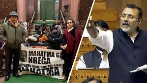 विपक्षी सांसद महात्मा गांधी राष्ट्रीय ग्रामीण रोजगार गारंटी अधिनियम (मनरेगा), 2005 को निरस्त किए जाने का विरोध कर रहे हैं। उनका आरोप है कि नया ‘जी राम जी’ कानून मूल अधिनियम के अधिकार संरचना को नष्ट करता है।