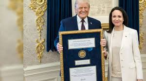 वेनेजुएला की विपक्षी नेता और नोबेल शांति पुरस्कार से सम्मानित मारिया कोरिना मचाडो ने कहा कि उन्होंने व्हाइट हाउस में बंद कमरे में हुई मुलाकात के दौरान अमेरिका के राष्ट्रपति डोनाल्ड ट्रंप को अपना नोबेल शांति पुरस्कार मेडल भेंट किया। उन्होंने इस कदम को दोनों देशों की आजादी की साझा लड़ाई का ऐतिहासिक प्रतीक बताया।