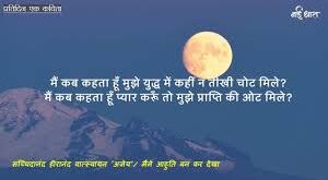 मैंने आहुति बन कर देखा… -अज्ञेय- मैं कब कहता हूं जग मेरी दुर्धर गति के अनुकूल बने,मैं कब कहता हूं जीवन-मरू नंदन-कानन का फूल बने?कांटा कठोर है, तीखा है, उसमें उसकी मर्यादा है,मैं कब कहता हूं वह घटकर प्रांतर का ओछा फूल बने?मैं कब कहता हूं मुझे युद्ध में कहीं …